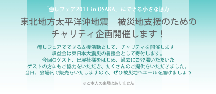 この度は東北関東大震災の被災者の皆さまに,心からお見舞い申し上げます。一日も早く被災地の復旧及び、被災者の方々のお役に立てればと思い、今回、チャリティに参加させていただきます。
