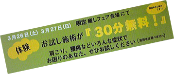 揉まない、押さない、叩かない。けれども呼吸によって筋肉の弛緩と緊張を利用して身体を整え、人間本来の免疫力を呼び覚ます施術が「バランス活性療法」です。身体に負担をかけない優しい手技。「整体」というカテゴリでは収まらない施術は、言葉や口で説明するよりも、体験してその効果を実感するのが一番です! 癒しフェアでは30分1,000円で体験できるところ、無料チケットが抽選プレゼントで当たります! 肩こり、腰痛などお困りの症状がある方はぜひお試しを。
