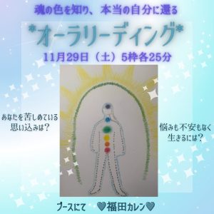 1月29日(土)、フルータリアン 福田カレンさんによる、自我の枠組みから自由になり、本来の自分を生きる:オーラリーディングセッションを、癒しフェア展示会場で開催します!このセッションでは、オーラの色や質感や状態を手がかりに、どのような思い込みを持ちやすい魂なのかを読み解いていきます。本来の自分として生きる手がかりとしてオーラリーディングをご活用ください。限定5枠です。