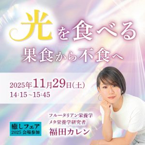 私たち人間は本来、果実と光で生きる存在。地球の変化とともに、私たちの心や身体も少しずつ変わり始めています。果食から不食(光食)への道をやさしくひもとき、自然と調和しながら、光に満ちた生き方へゆるやかにシフトしていくには?フルータリアン実践者の福田カレンさんにレクチャーしていただきます!