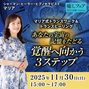 大好評のマリア式トランスワーク&トランスヒーリングを、癒しフェア2025東京でも会場+オンラインで開催決定!参加者から開催後、後々楽になった、よくなったという感想が続々と寄せられ、回を追うごとに進化するマリアさんのワーク。参加者も繰り返し参加することで、その度に意識のさらに深いところの自分自身と邂逅。今回は過去生や宇宙の出身星へと退行し、深いヒーリングとともに、覚醒への道を開いていきましょう。