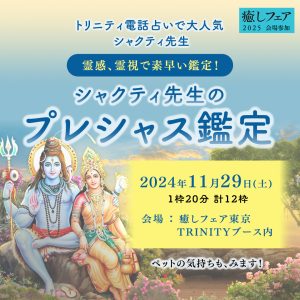 すぐ答えが欲しい方、すぐ癒されたい方に対して、素早いリーディング、ヒーリング、ご祈祷と、素早い鑑定で定評のシャクティ先生! トリニティ電話占いでも大人気のシャクティ先生が、11月29日(土)【癒しフェア2025東京】展示会場にて、鑑定ブースを出します! 行き詰まりの原因をさぐり、問題解決へと導くのが得意。霊感、霊視で素早い鑑定を求める方はぜひ! ペットの気持ちもみてくれますよ!